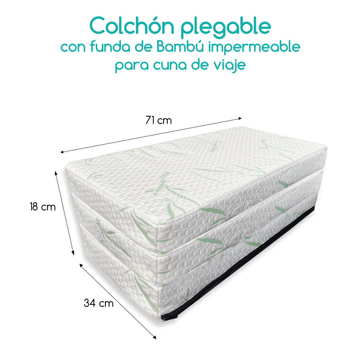 Colchón de cuna de viaje o corral Plegable, superficie de Bambú, impermeable, con espuma de Alta Densidad con medida de 102 x71 x6 cm. Conformado por espuma y una cubierta : Interior de espuma HD que brinda firmeza, para un profundo y lago descanso. Fácil de transportar ya que se puede doblar para ahorrar espacio y facilitar el manejo. La cubierta de bambú certificado, más fresco que el algodón permite regular la temperatura de tu bebé. Esta cubierta es impermeable fácilmente desmontable, nunca mas se manchará tu colchón debido a su tecnología TPU que garantiza impermeabilidad y transpirabilidad. La impermeabilidad no hace ruido como plásticos comunes, y la transpirabilidad le da a tu bebé un descanso seco y profundo. La cubierta se lava en lavadora y/o secadora temperatura baja.